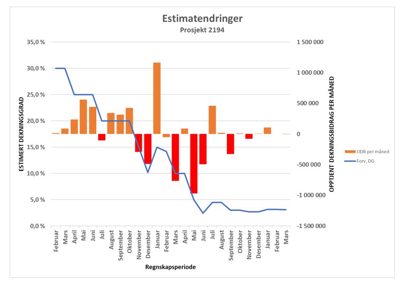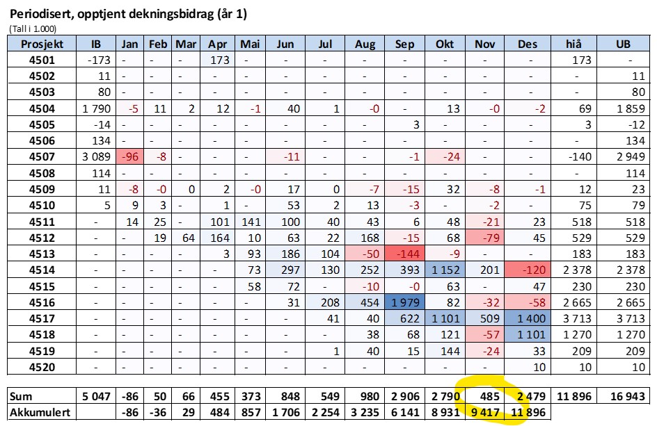 "En situasjon med operasjonell overkapasitet - at entreprenøren har for lite oppdrag, vil redusere kapitalbinding i prosjekter under utførelse vesentlig og bidra til at likviditeten forbedres. "Utført, ikke fakturert" og kundefordringene i balanseregnskapet konverteres til bankinnskudd. Det er bra, men likevel ikke bra. Entreprenøren trenger oppdrag for å dekke inn sine ikke-prosjektrelaterte kostnader, så det er kun en midlertidig forbedring vi vil være vitne til"